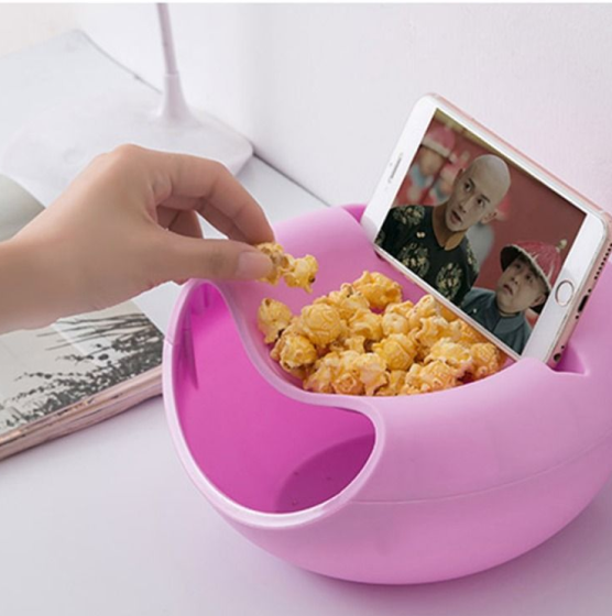 A convenient phone slot is built into this food-grade plastic bowl so you won’t have to pause or miss a second of your game, movie, or livestream while enjoying a snack. Our phone slot fits phones up to 6.7in/17cm in height (remember, the height becomes the width when you place the phone in landscape mode), making it great for just about any phone make. The bowl works great too if you are just watching something on your laptop or TV.