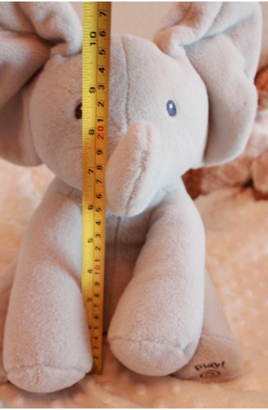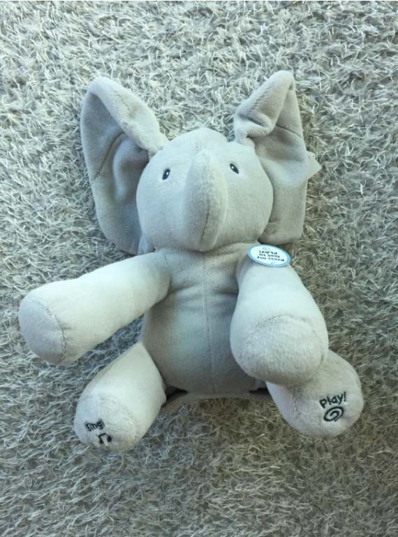 Your child’s new elephant friend has two fun functions: press the left foot to play an interactive game of peek-a-boo; press the right foot to hear the song “Do Your Ears Hang Low” in a cute child’s voice. During both play modes, the elephant’s ears move and flap, like the elephant has come to life: it’s sure to delight your little one.