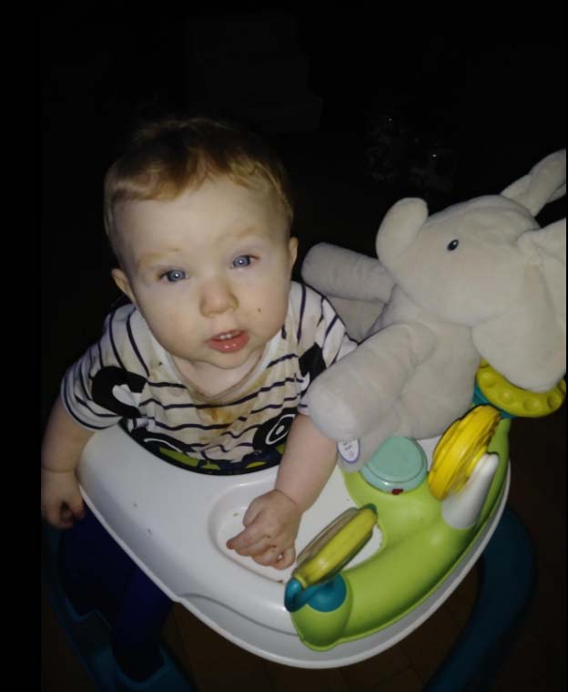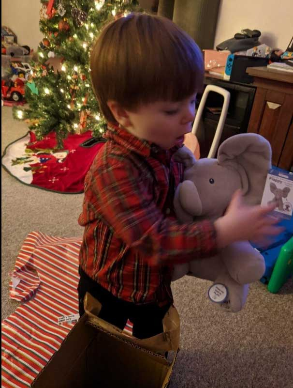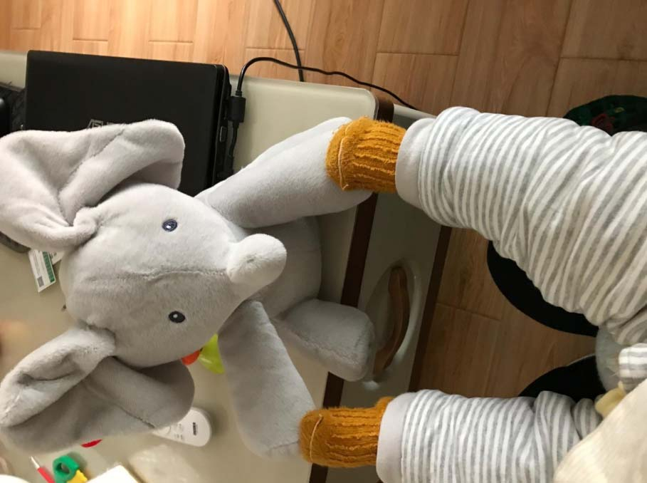 It was gifted to my almost 4-month-old son for Christmas this year. The voice of the elephant is very sweet and not annoying like some toys. It is a loud volume and piques the baby’s interest. The ears cover the eyes and pass for a second before opening up. I like that it has buttons on the feet for singing or playing. It is crazy soft. So soft I almost dropped it a couple of times lol.