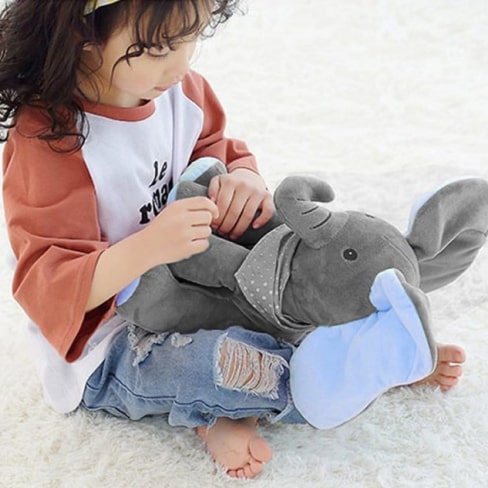 One of the largest, strongest animals in the animal kingdom sizes down to be a soft, cuddly friend to your little child. Our Peek-A-Boo Elephant Toy sings and interacts with your loved one for comfy, safe companionship while you’re busy doing housework or working.
