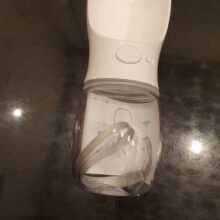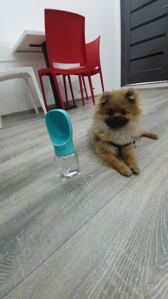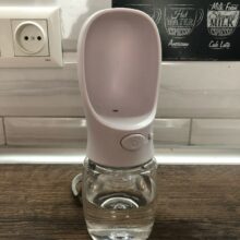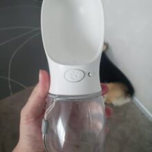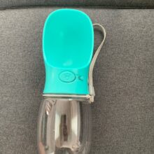This is a great little dog water bottle that is very convenient! When we travel, I keep it in one of the cup holders because it fits nicely there. It took a few washings to reduce the plasticy smell but it was fine after that.