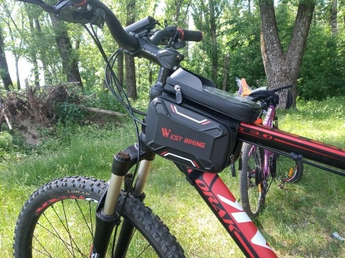 I purchased this to add to my Mountain bike. So far I've used it on about 20 miles of road riding. and it did not shift around. It securely holds my phone. The touchscreen works flawlessly. The 3 hook and loop straps securely keep the bag attached to the frame. There is a lot of room in the bag for keys, sunglasses, and other small items. Bag is very light. It's a little wider than I expected, but it would need to be to hold my larger phone. Overall a great product. Very happy with the purchase.