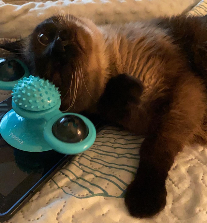 My cat's favorite new toy. I was looking for something to incentivize her to go up on her perch and look out the window, because she wasn't interested before. Now that I put this toy up, I can't keep her off the perch.